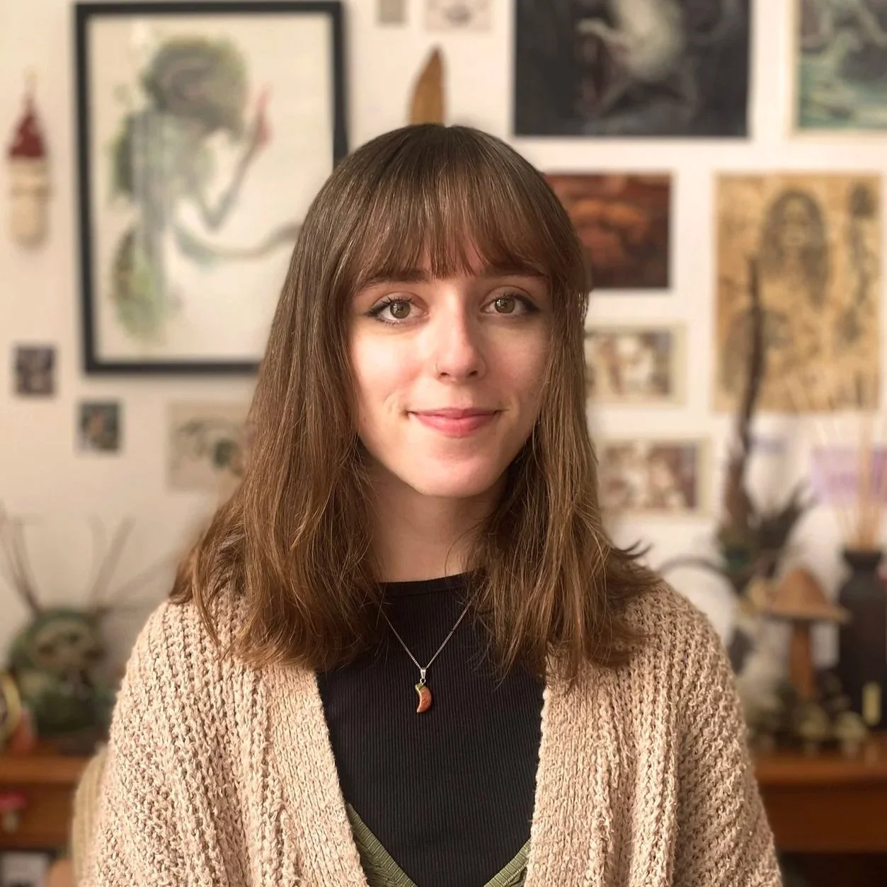 Hi my name is Shelbi, I am a pagan witch. At a very young age I was fascinated with death in both fearing it and being intrigued by it. My artistry started with pencil and I would draw whatever was on my mind. In the last couple of years I have become obsessed with collecting taxidermy in the form of bones and finding feathers out and about. Gradually this has evolved into the jewellery you see today. As I practice Norse paganism, I always wanted to make my own rune set out of antler and, with encouragement from friends and family, the rune set became a product within my roster. I try my best to make my jewellery where the animal bone and gems match each other both visually and spiritually and the pyrography brings back my inner love for drawing