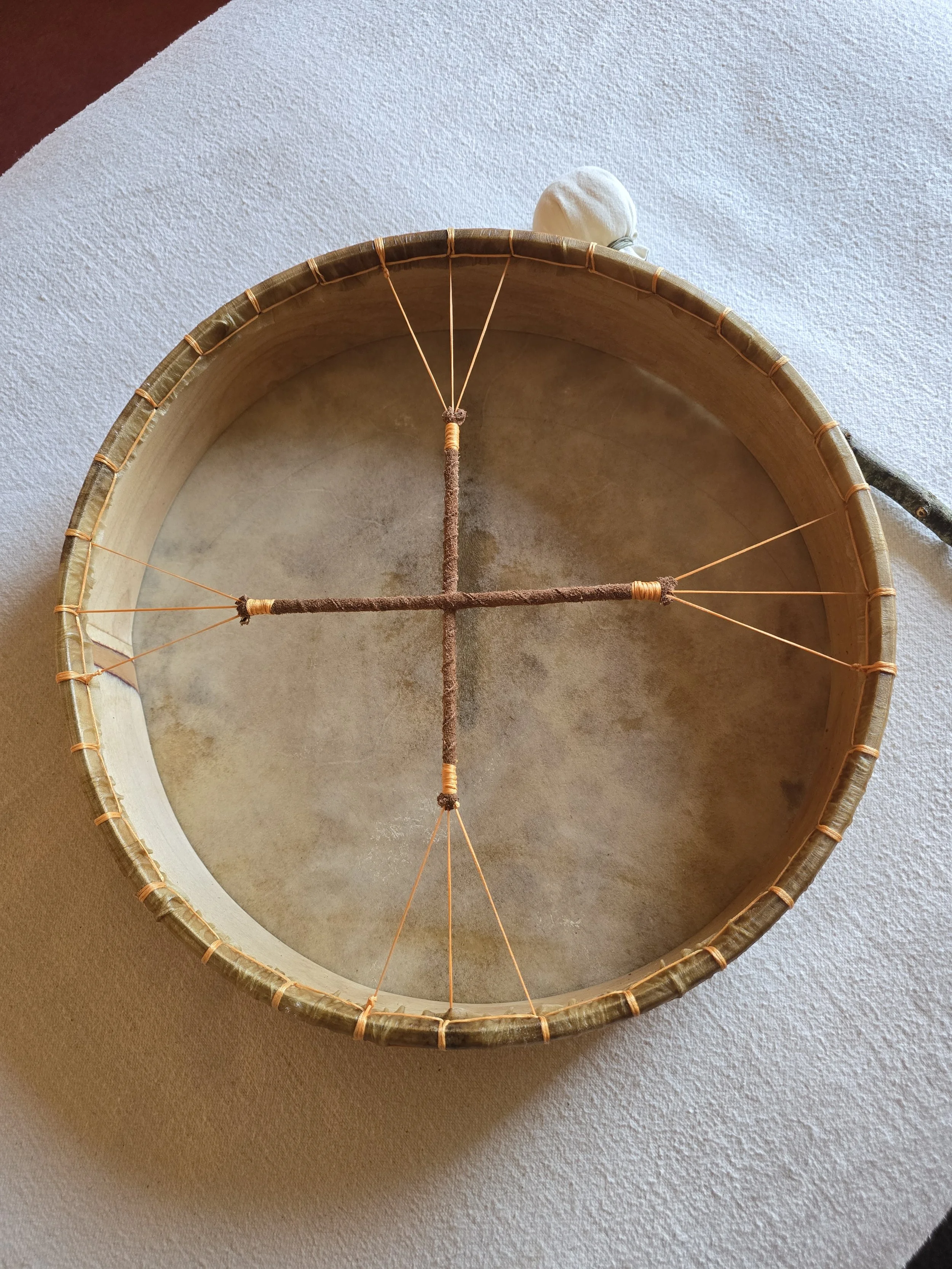 Hi there, My name's Graig, I’m a Drum, Sacred tool maker, based down in Cornwall with 20 years of healing and sound work behind me. I started to make drums 3 years ago after completing the sacred drum course through the college of sound healing and found a deep connection and joy being able to bring a lifetime of different skills into the items I craft. My drums are a little different in that they are all hand stitched to the hoop. I studied different traditional ways of making drums and saw how the northern European drums are made and after some trials found this way works well to create a really stable drum. Stitching lets me give them more tension allowing them to keep their voice in the UK’s damper climate so they work better when outside than a laced drum. They will still drop their tone but a gentle warming brings them back easily!