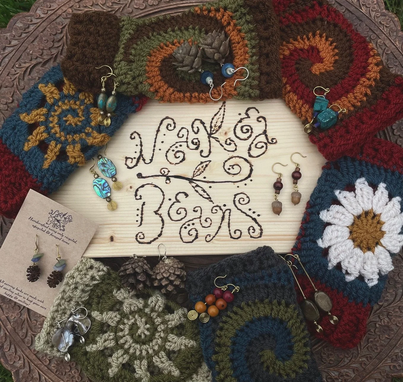 Naked Beans is my passion project, a quiet rebellion against the chaos of fast fashion. It was born from a love of nature, creativity and a desire to return to a slower, more intentional way of living. I use my craft as a way to give a new lease of life to pre-loved or foraged treasures. My jewellery is crafted using recycled sterling silver or brass, combined with upcycled beads from disused jewellery or treasures found while foraging on the forest floor. My crochet handwarmers are made with recycled acrylic yarn — soft, cosy, and consciously created. I love creating with the flow of the seasons, drawing inspiration from the colours, textures and elements of each to feed my creativity and shape my designs.